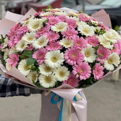 Букет из 101 белой и розовой герберой с добавлением зелени